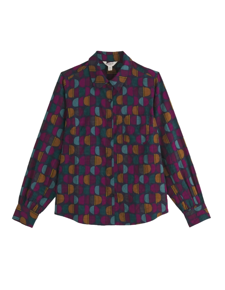 The Isla Shirt reimagines the classic button-up with contemporary refinement. Its semi-fitted silhouette flatters without clinging, whilst the structured collar maintains timeless appeal. Gathered sleeves add subtle movement and visual interest, whilst the oversized workwear-inspired pocket delivers practical style. A thoughtfully placed split hem enables effortless layering and versatile styling. The Half Moon Stamp Maritime print brings distinctive character to this essential piece, making it equally at home layered over basics or worn as a standalone statement. A modern wardrobe investment that transcends seasonal trends.