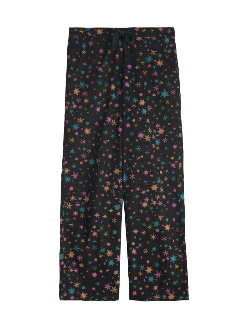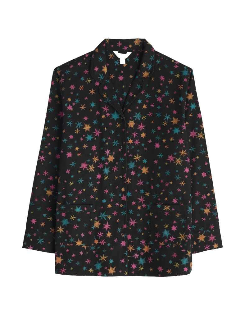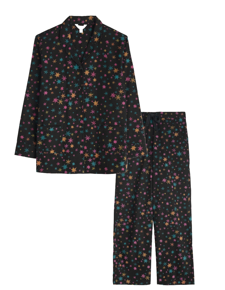 Indulge in comfort and style with our women's Pyjamas Simple Stars Flannel Pyjamas. Made from soft brushed cotton flannel, these cosy pyjamas feature a classic shirt with a patch pocket and wide leg trousers with a comfortable drawstring waistband. Perfect for winter nights, our festive prints make them the ideal gift for someone special.