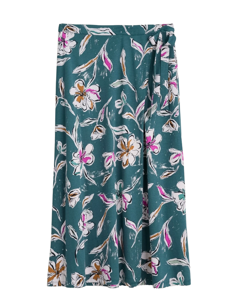 Women's Regular Crellow Wrap Skirt in Linework Floral Pool Embrace effortless summer style with this ankle-length wrap skirt, crafted from a luxuriously soft organic cotton blend. The distinctive Crellow design features a swirly linework floral pattern in a refreshing pool tone, while a deep waistband ensures a flattering fit. Secured with a single hip tie belt, the fabric drapes with natural elegance and feels wonderfully comfortable against bare skin. Perfect paired with a simple vest and espadrilles for an understated, seasonally appropriate ensemble.