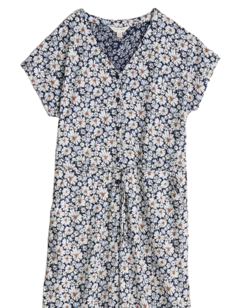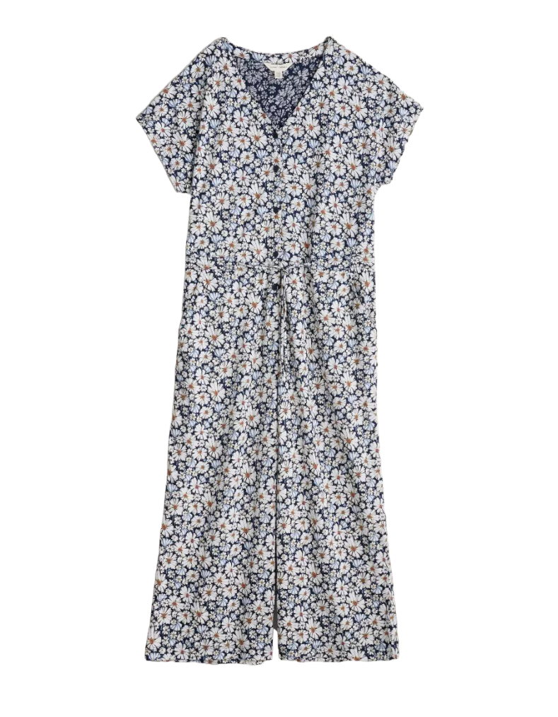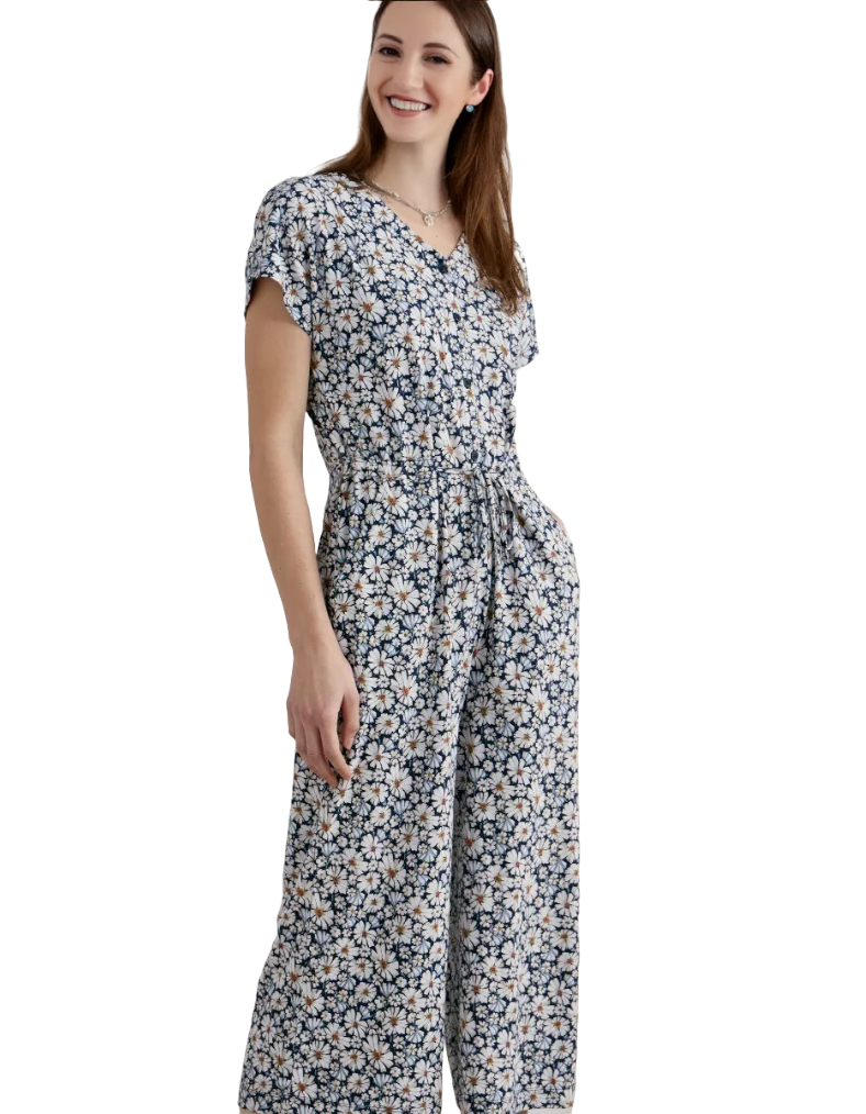 Effortlessly chic, the Rose Trellis Wide Leg Jumpsuit is a must-have for any wardrobe. Made from a soft, eco-friendly blend of cotton and TENCEL™ MODAL, it features a flattering V-neck button placket, adjustable drawstring waist, and wide culotte-style legs for all-day comfort. Perfect for any occasion, dress it up or down.