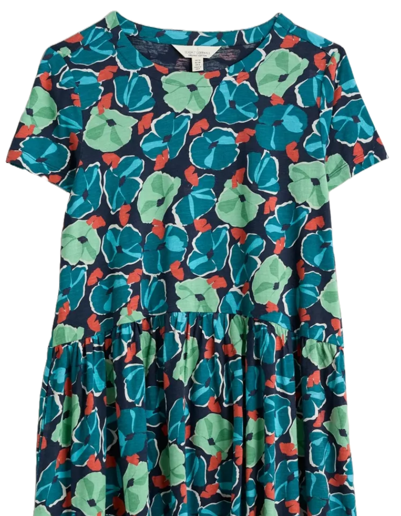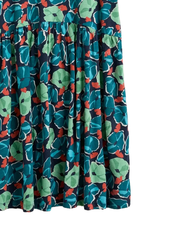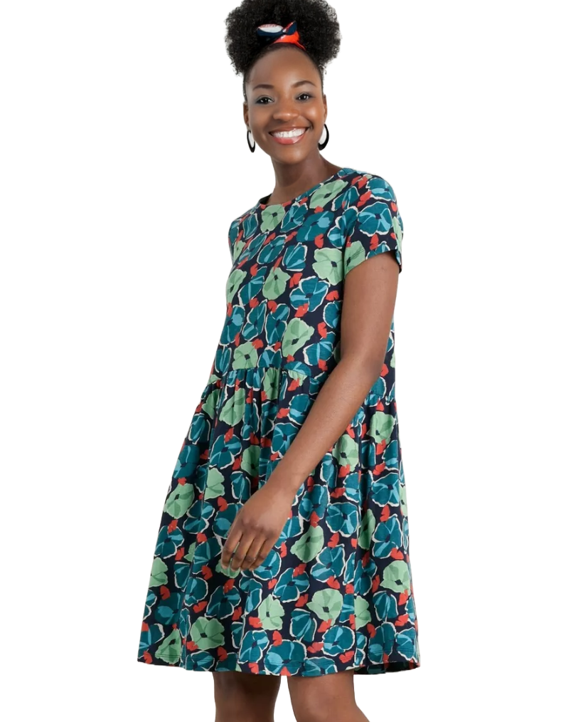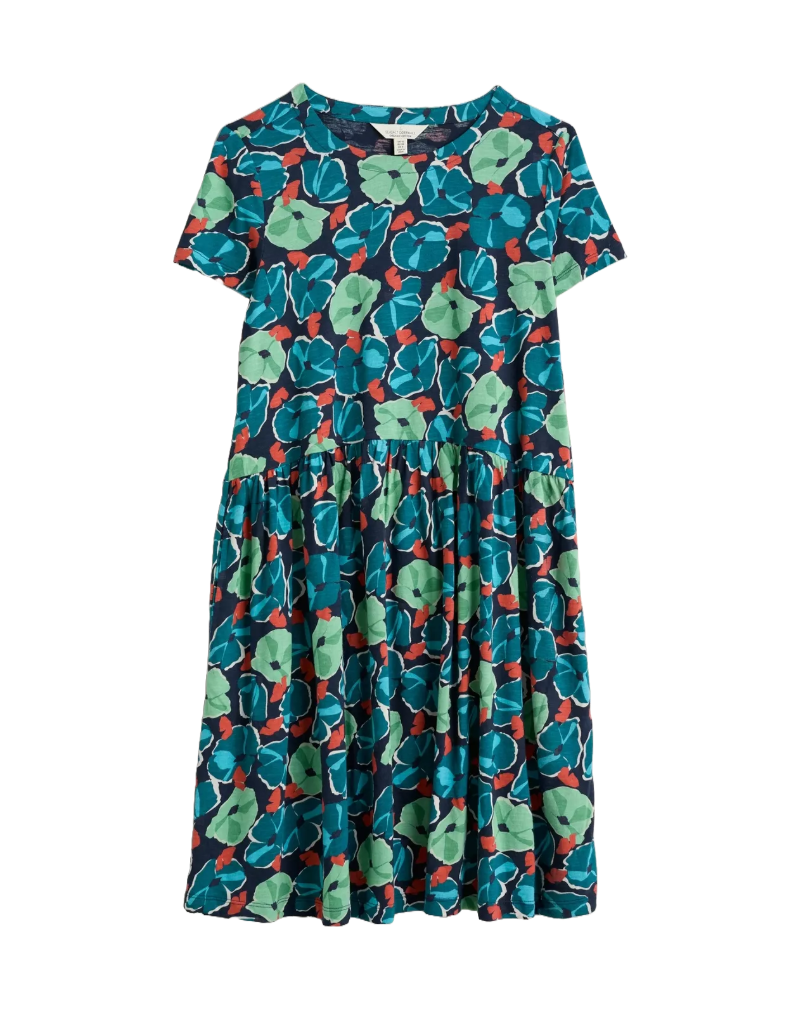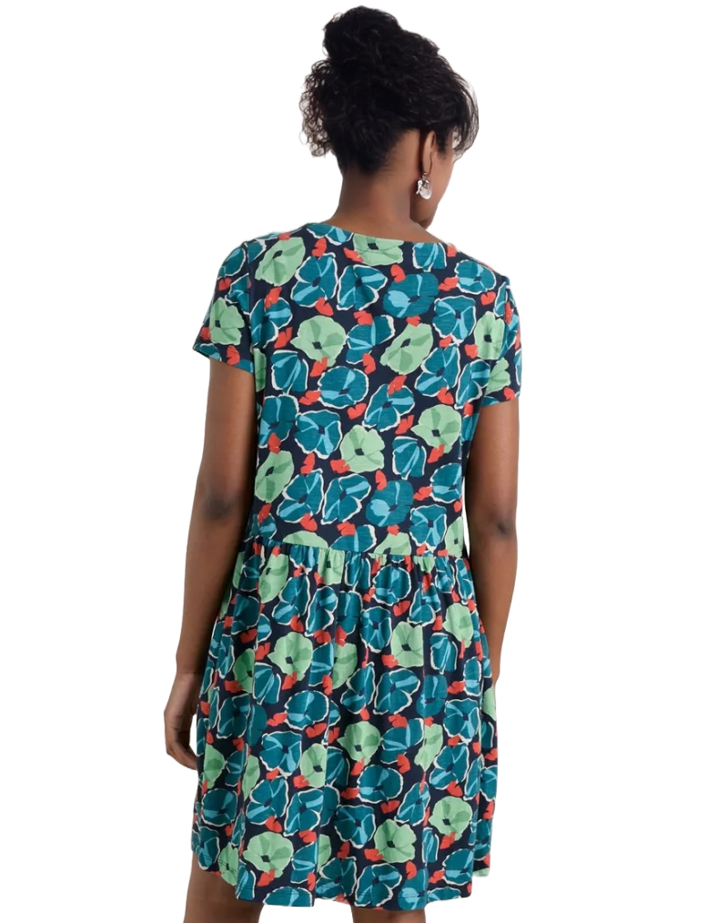 As a dress expert, I recommend our Women's Sea Mirror Jersey Dress in Teal Regu. Made from soft and breathable jersey cotton, this dress features a bold floral print and a flattering flared shape. The gentle gathers and hidden pockets add convenience and comfort. With a length just above the knee, it's perfect for any occasion.