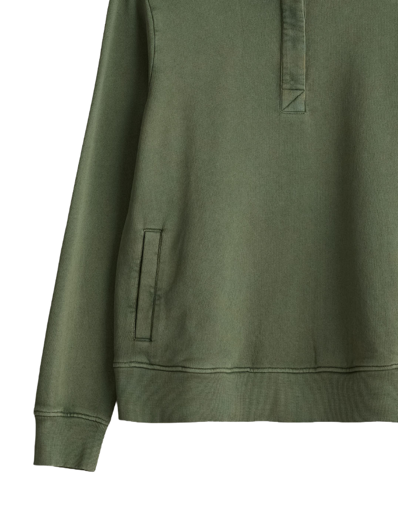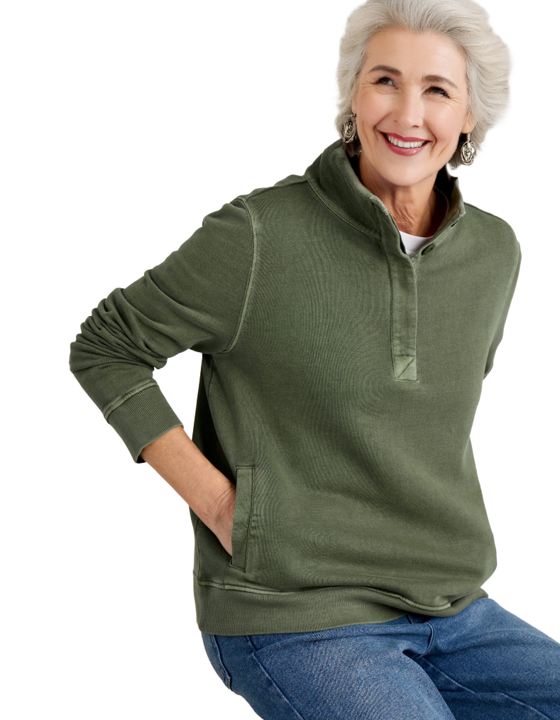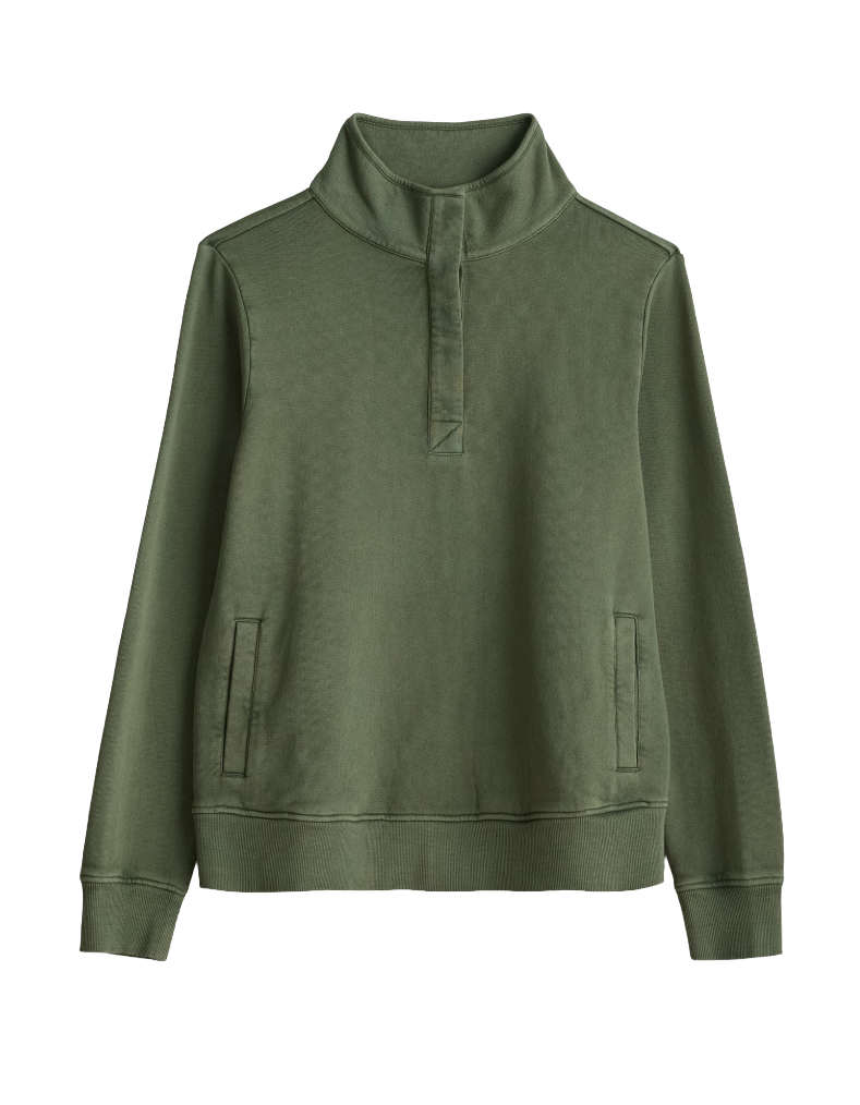 Elevate your everyday style with Seasalt's Women's Shank Heath Long Sleeve Button Up Sweatshirt in Green. Crafted from 100% organic cotton and garment-dyed for distinctive colour variations, this piece combines comfort with considered design. The high collar features a button closure for adjustable warmth, whilst practical hip pockets add functional appeal. Whether layered or worn standalone, this versatile sweatshirt delivers both aesthetic interest and wearability—a thoughtful investment for a refined casual wardrobe.
