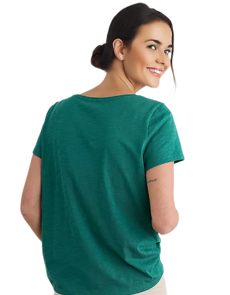 Elevate your everyday wardrobe with this sophisticated women's t-shirt, featuring a distinctive keyhole cutout at the scoop neckline that adds contemporary flair. Crafted from GOTS-certified organic cotton, this piece delivers exceptional breathability and comfort for all-day wear. The premium fabric ensures durability whilst maintaining a soft, natural feel against your skin. Perfect for layering or wearing solo, this versatile green tee transitions seamlessly from casual to polished styling.