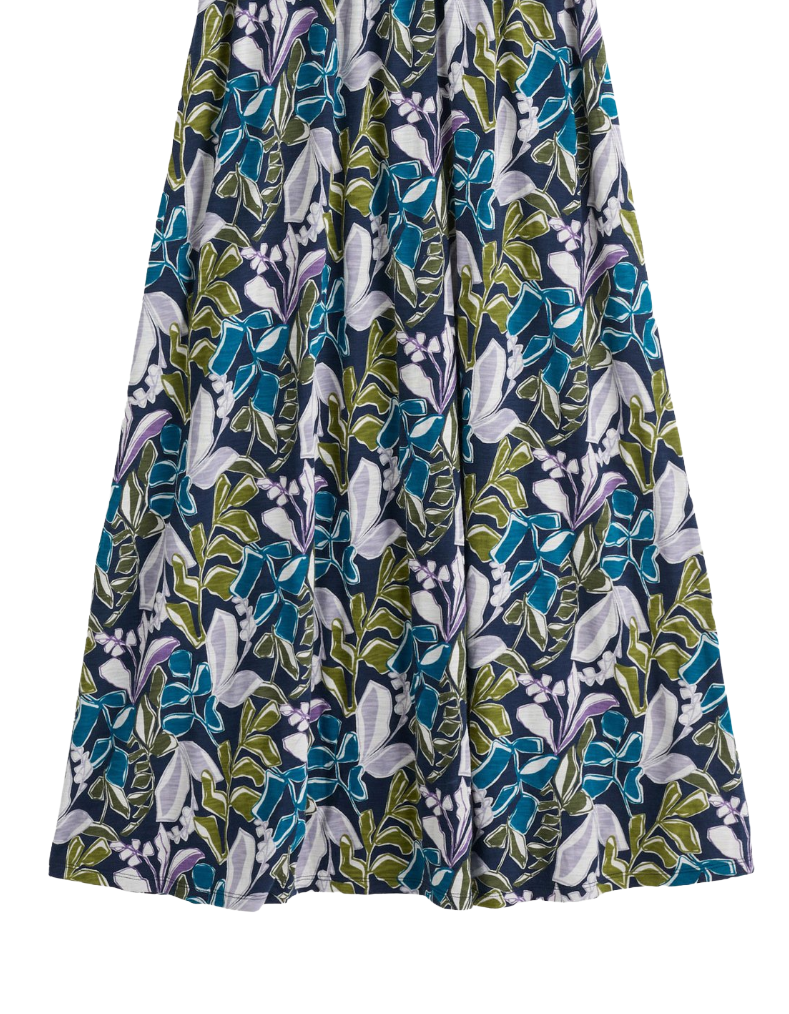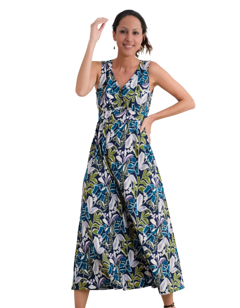 Crafted from soft organic cotton, the Women's Sleeveless Polmanter Dress in Linear Leaves Maritime offers breathable comfort and eco-friendly style. Its flattering empire line enhances your silhouette, while the sleeveless design keeps you cool on warm days. Featuring a distinctive linear leaves print, this dress combines effortless elegance with a playful summer vibe, making it an ideal choice for relaxed outings or seaside strolls.