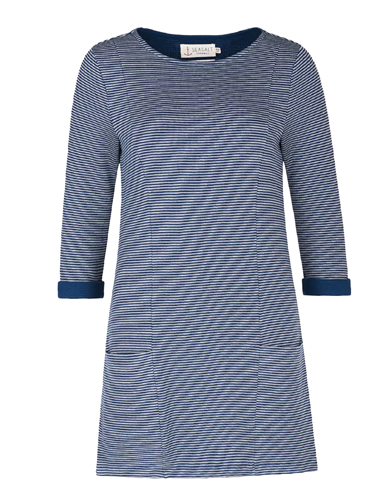 The Seasalt Clew Tunic combines contemporary sportswear aesthetics with everyday comfort. Crafted from a textured waffle-weave sweat fabric, this modern tunic features yarn-dyed stripes that deliver authentic Seasalt character. The panelled construction flatters the silhouette, whilst a relaxed boat neckline and slouchy pockets enhance its laid-back appeal. Three-quarter length sleeves with turn-up cuffs offer versatile styling options. Layer effortlessly over leggings for weekend ease, or pair with ankle boots and a contrasting knit for polished casual wear.