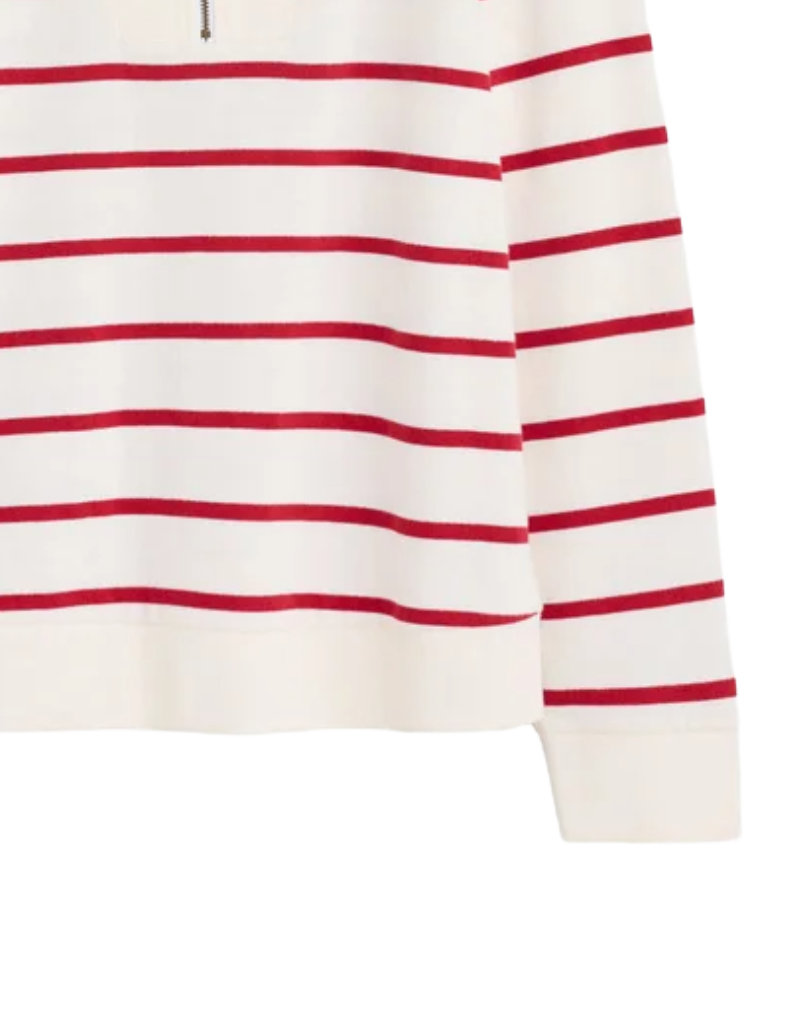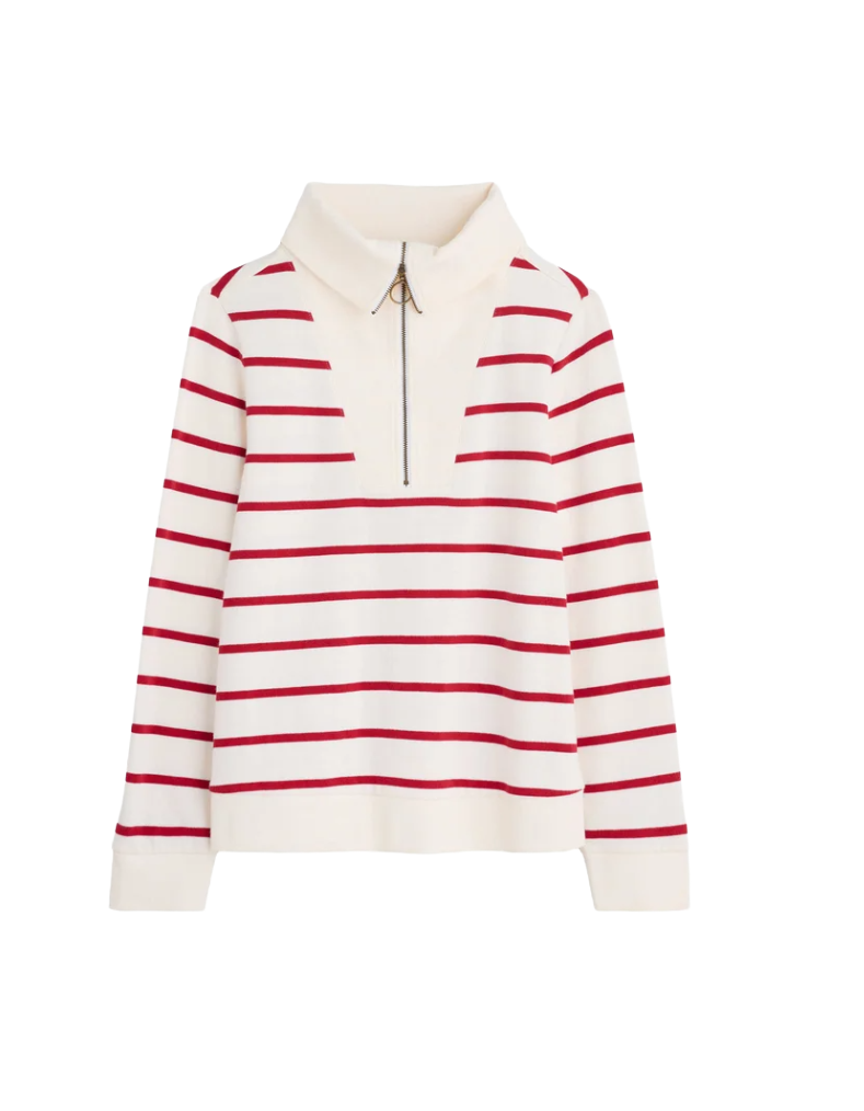 Elevate your everyday wardrobe with this sophisticated collared sweatshirt, designed with nautical inspiration and refined details. The statement maritime collar creates instant visual interest, while the full zip neckline offers versatile styling options. Ribbed texturing flows seamlessly from the collar through the hem and deep cuffs, which gather the sleeves into a subtle blouson silhouette for a contemporary, relaxed fit. Crafted from soft fabric, this piece transitions effortlessly across seasons, pairing beautifully with classic striped tops and denim for a polished, timeless look that works from casual weekends to relaxed office settings.