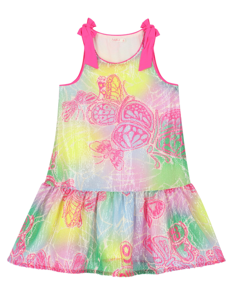 This Billieblush girls' dress combines vibrant style with comfortable design. Crafted from soft, silky polyester, it showcases an all-over sequin butterfly pattern in vivid rainbow colors. Bright pink shoulder straps with bow accents and pink side trims add playful detail, while the dropped waist and flounce skirt create a flattering silhouette. Fully lined with viscose for smooth comfort, the dress fastens easily with a single button at the back, making it both charming and practical for special occasions.
