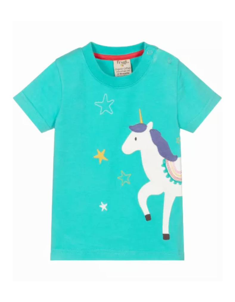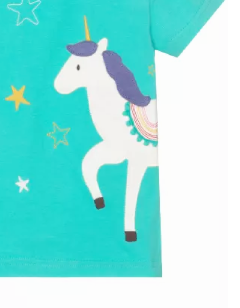 Frugi Girl's Short Sleeve Unicorn Avery Applique Top in Pacific Aqua