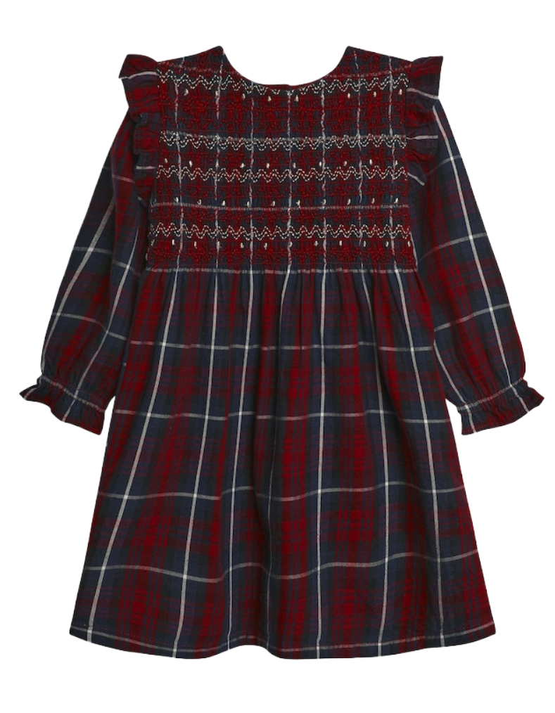 This charming girls’ long sleeve dress features a classic red tartan print with delicate gold smocking and frilly shoulder details, perfect for festive occasions. Crafted from soft, breathable 100% cotton and fully lined for comfort, it ensures ease of movement and warmth. The button-back fastening and gathered waist enhance the fit and silhouette, making it an ideal choice for little dancers and holiday celebrations. Machine washable for practical wear through the season.