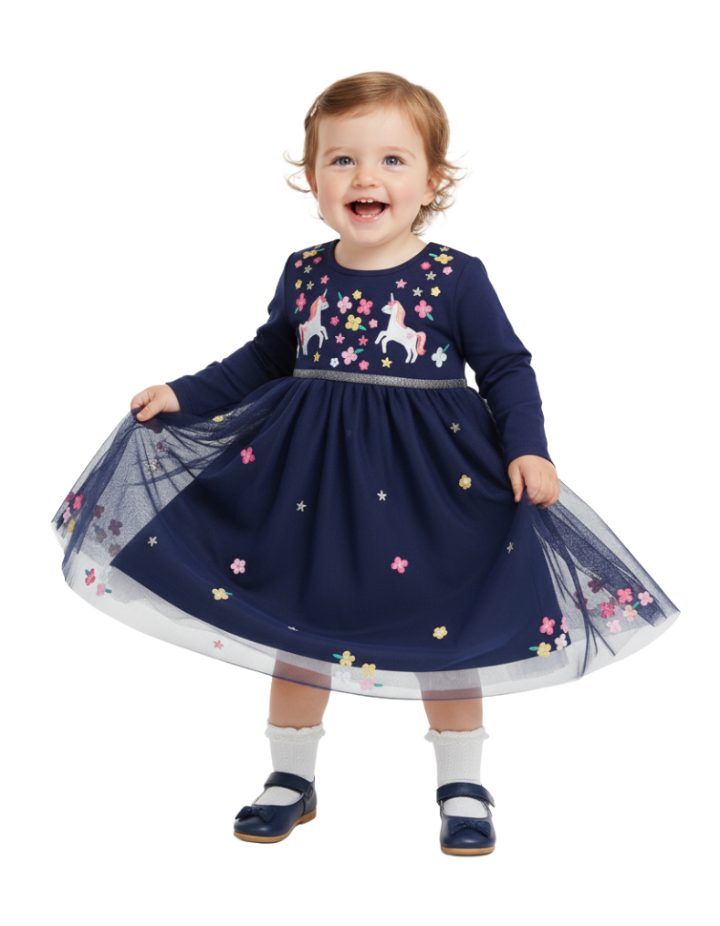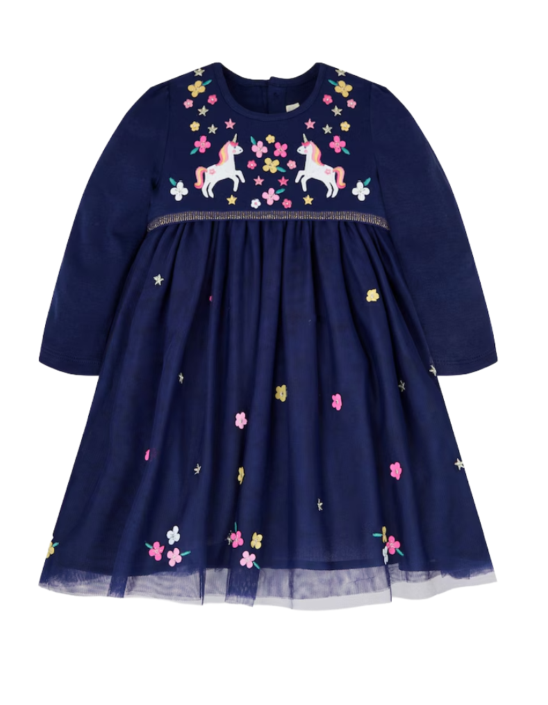 This navy Jojo Maman Baby unicorn party dress combines delicate design with comfort. Featuring layers of embroidered tulle and a floaty skirt lined with soft voile, it moves beautifully as your child plays. The long sleeves and button-back ensure a secure fit, while the elegant gold waistband adds a charming touch. This dress is both stylish and machine washable, perfect for special occasions.