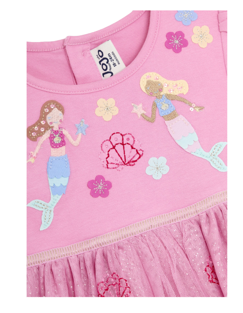 Celebrate special moments in enchanting style with this mermaid-themed party dress. Crafted from luxurious layered tulle, it features delicate appliqué detailing and charming scallop-edged hemming that captures the magic of an underwater princess. The soft pink palette and whimsical design make it ideal for birthday celebrations, weddings, and memorable occasions. Perfect for creating lasting memories while your little one feels confident and magical.