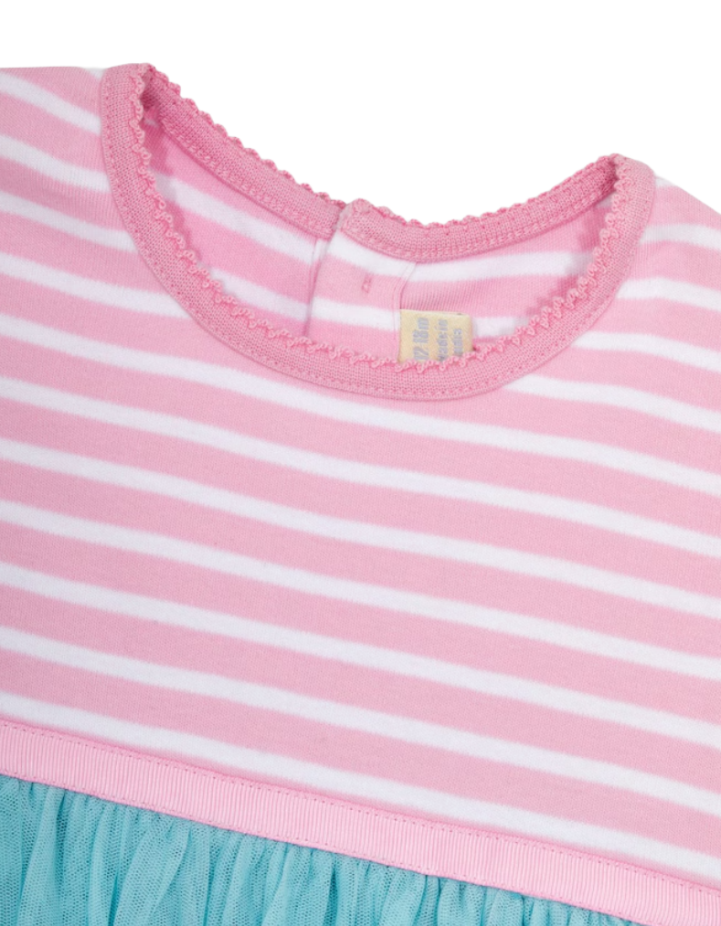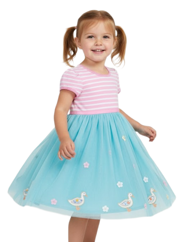 This charming party dress is designed for joyful movement, featuring a full blue tulle skirt adorned with playful ducks and flowers that gather elegantly at the waist. The soft pink striped top offers comfort with short sleeves, a round neckline, and a back button closure for easy dressing. Its contrasting colors and prints create a lively, festive look perfect for special celebrations and lively dancefloor moments.
