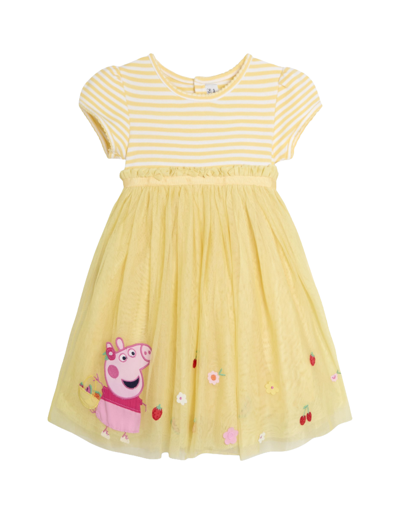 Celebrate special occasions with the JOJO Maman Girl's Baby Peppa Pig Tulle Party Dress in Yellow. Featuring Peppa Pig gathering fruit and flowers along the tulle hem, this dress captures the charm of childhood favourites. The striped bodice with puff sleeves adds a classic touch while ensuring comfort. Perfect for garden parties, birthdays, and gatherings, it allows little ones to feel special and enjoy their day in a soft, playful outfit designed for delicate wear.