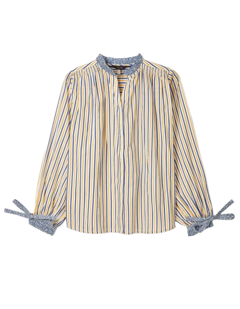 The Joules Women Anna Frill Neck Striped Blouse in Yellow/Blue combines expert design with seasonal versatility. Crafted from crisp cotton, its relaxed boxy fit ensures comfort, while the frilled open neck and self-tie cuffs add refined detail. Featuring a button placket and shirred paneling on shoulders and back, this blouse offers both style and subtle structure. Ideal for summer wear, it also layers effortlessly for cooler months, making it a smart addition to any wardrobe.
