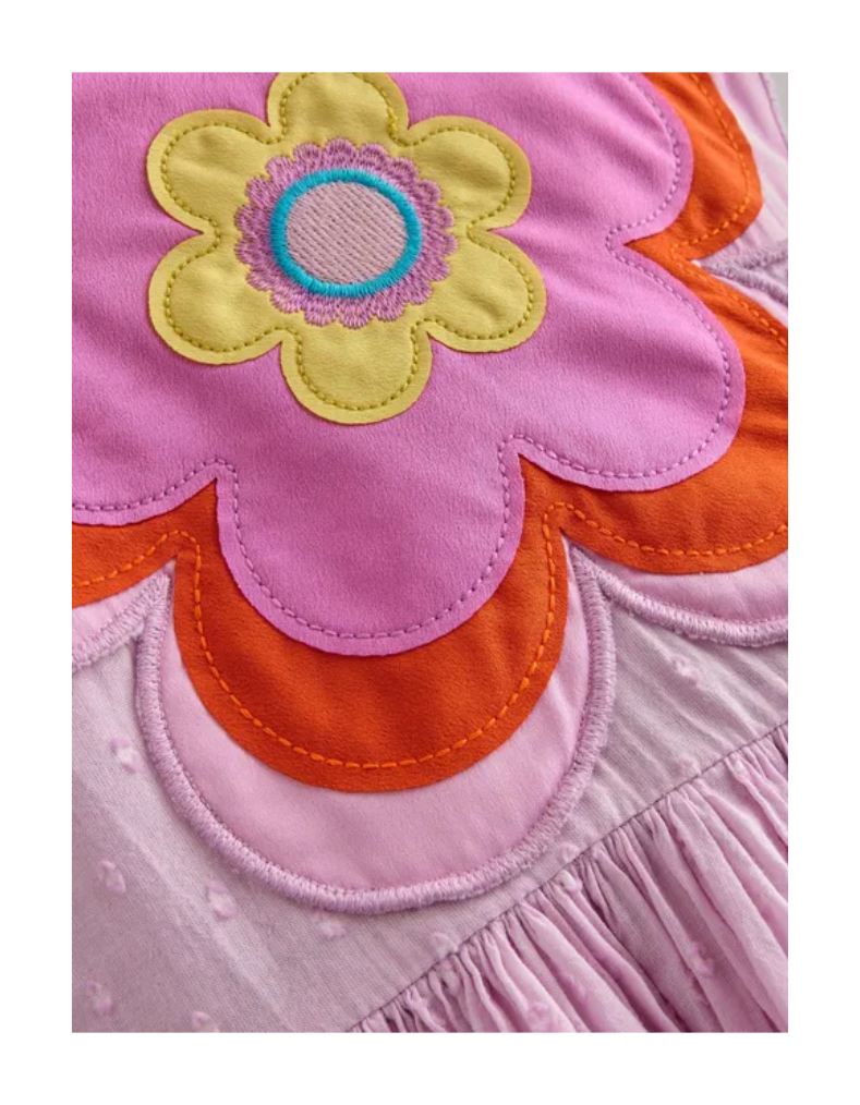 This Mini Boden Girls' Applique Back Dress in Pink Floral features vibrant, eye-catching appliqués that add playful charm. Crafted from 100% cotton with a cotton lining, it offers breathable comfort ideal for summer wear. Convenient buttons at the shoulder and a side zip ensure easy dressing and a perfect fit.