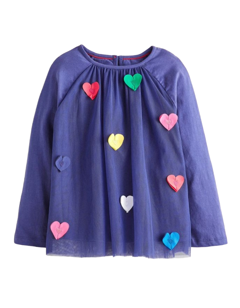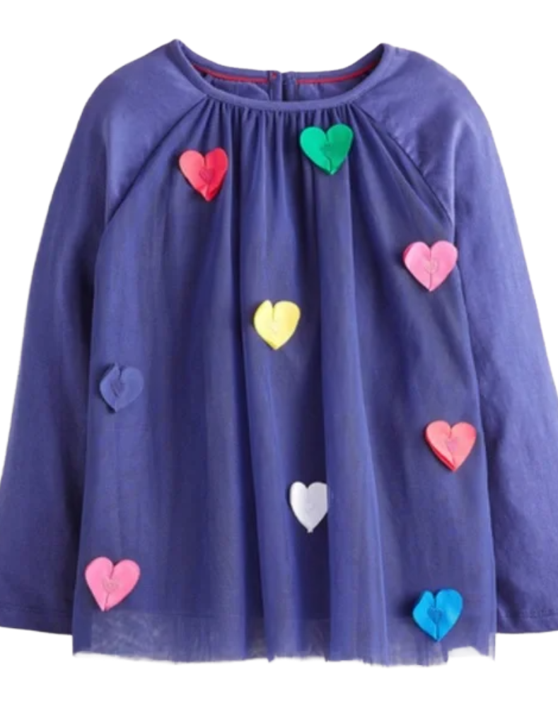 This Mini Boden Applique Tulle Top in Starboard Blue Flutter Hearts combines delicate tulle accents with comfortable 100% cotton fabric throughout the main body, lining, and sleeves. Designed with fluttery details, it adds a playful twist to party wear while remaining practical with easy machine wash care. A stylish and breathable choice for festive occasions, now available as a clearance item.