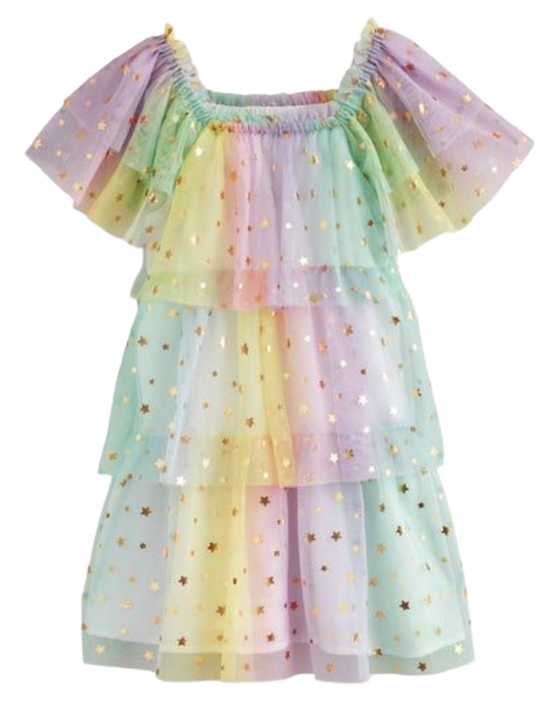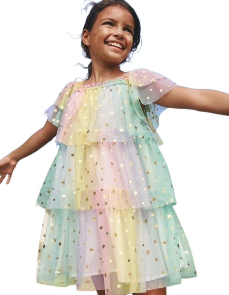Mini Boden Girl's Tiered Tulle Dress in Multi Ombre Gold Foil Star
