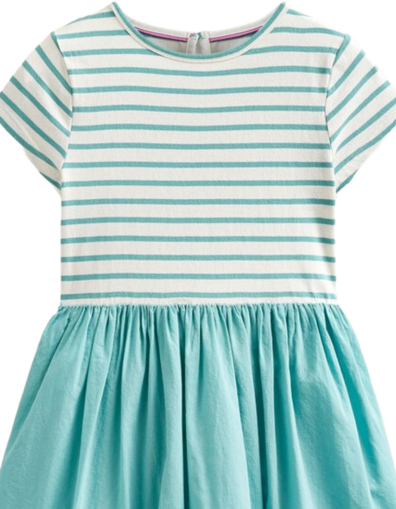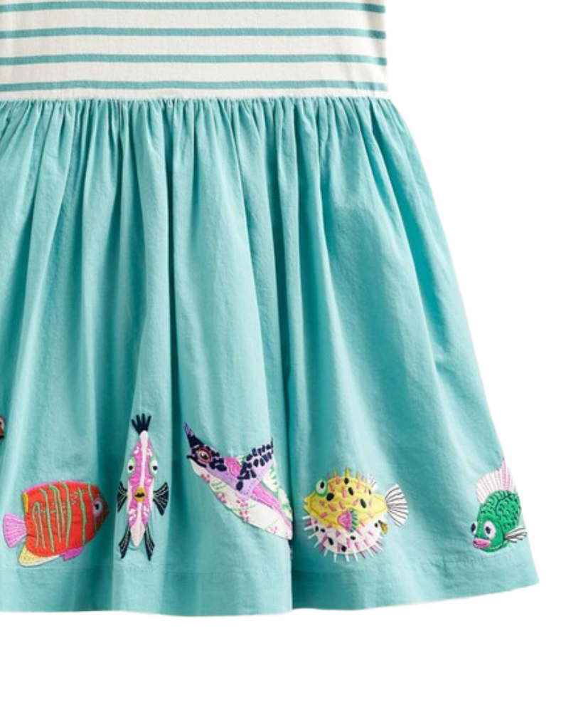 This Mini Boden girl's dress combines a soft striped jersey top with a full, swishy skirt for a flattering fit and flare silhouette. Crafted from pure cotton, it ensures comfort and breathability. The hem features charming sea life appliqués, adding a playful, detailed touch to the Georgian Blue and Vanilla color palette. Ideal for both casual and special occasions, this dress offers style and ease for young wearers.