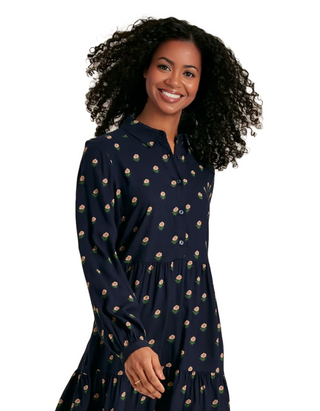 Elevate your dress collection with the Eva Navy Printed Shirt Dress. Crafted from 100% Livaeco by Birla Cellulose™, this versatile piece can take you from day to night. The tiered skirt and form-fitting silhouette add elegance, while the button-down fastening and seasonless print make it a year-round favourite.