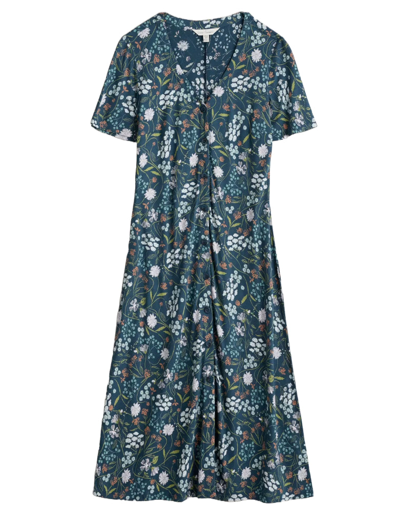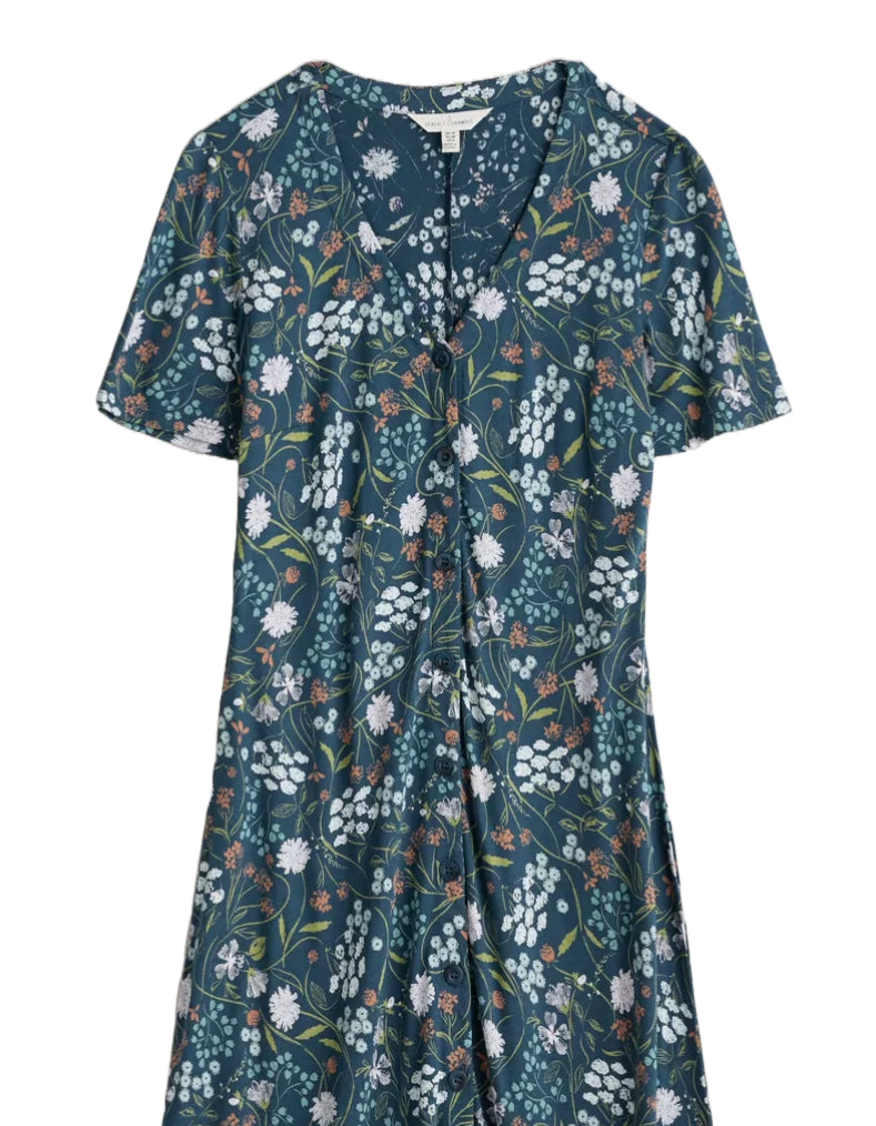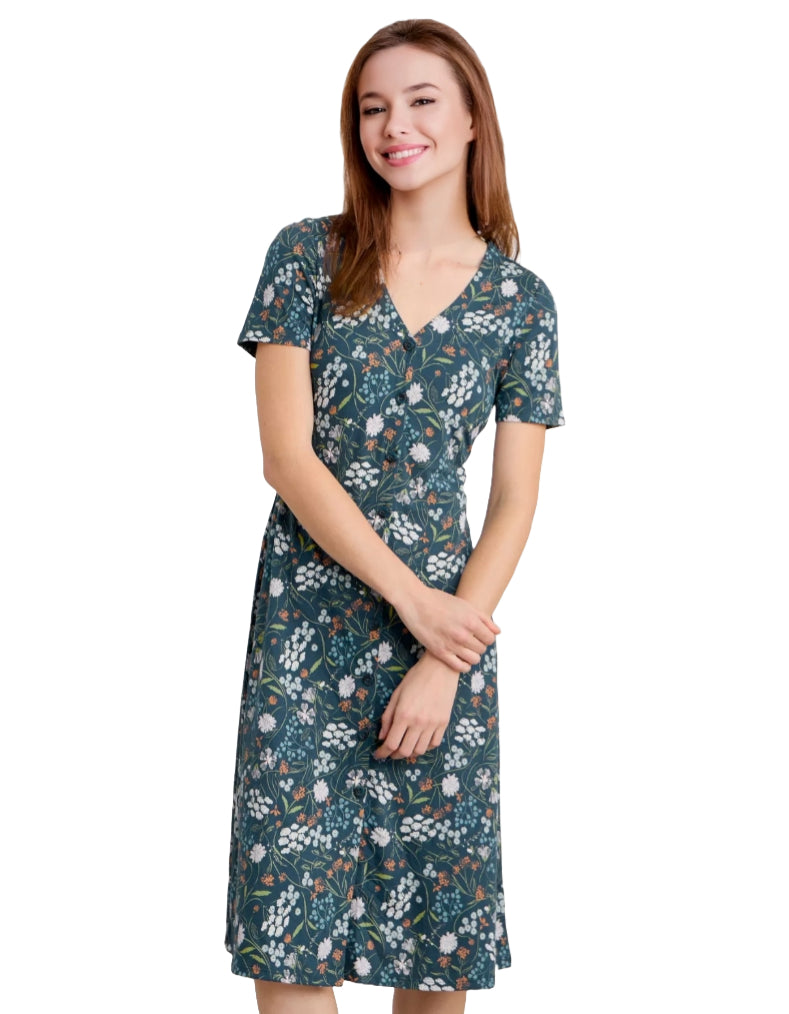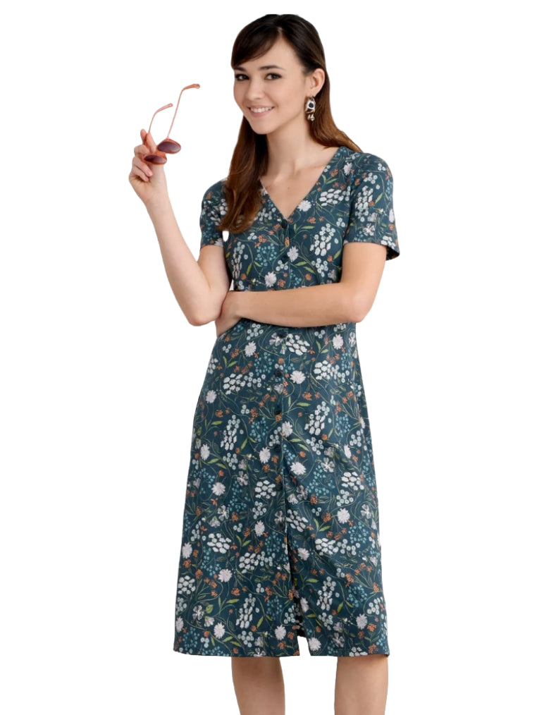 Elevate your summer wardrobe with our new and improved Women's Short Sleeve Lilian Tea Dress. This timeless piece features a button-through front, A-line silhouette, and soft V neck for a flattering fit. Crafted from a blend of organic cotton and TENCEL™ Modal, the dress offers a smooth, soft drape and a gentle, swaying movement to our unique prints.