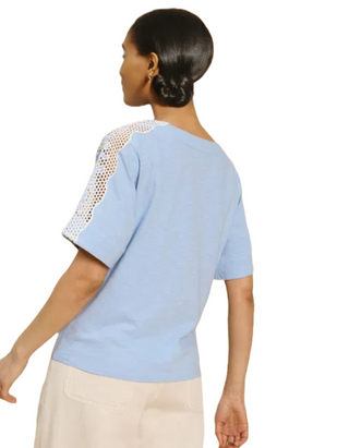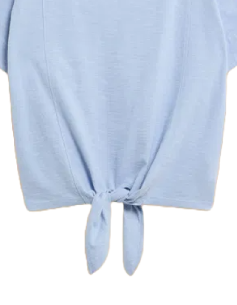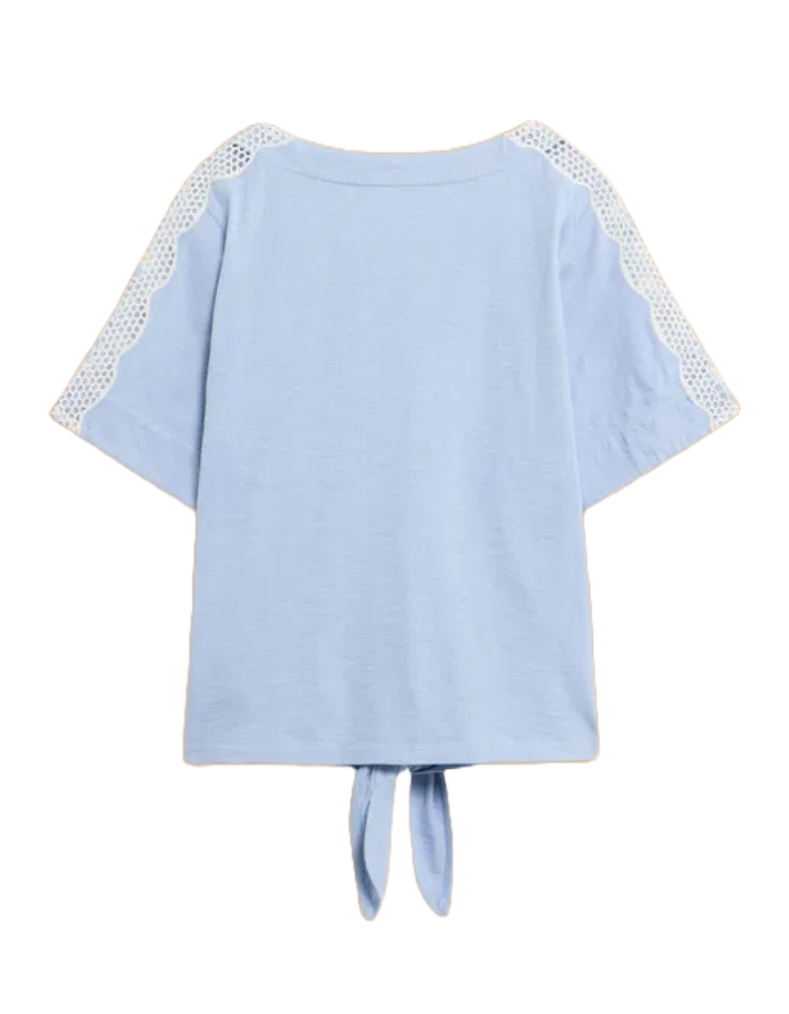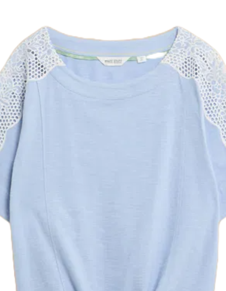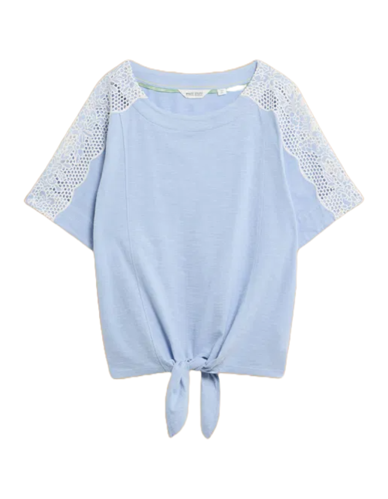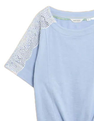 Introduce the Women's Short Sleeve Sara Tie Hem Embroidered Sleeve Blouse in Blue to your wardrobe for a touch of elegance. Made with soft cotton, the blouse features intricate embroidered sleeves and a round neck for a textured effect. Ideal for pairing with floaty midi skirts, it's perfect for summer days exploring the city.
